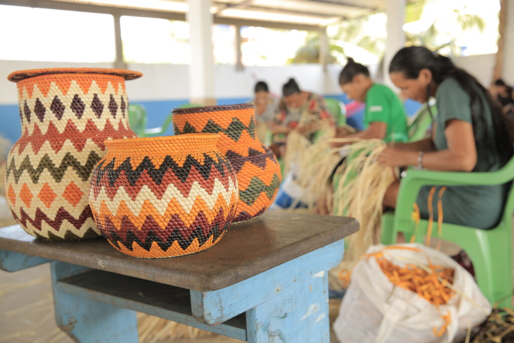 Mulheres de cinco comunidades da região do rio Arapiuns participaram, na comunidade Vila Brasil, de uma oficina criativa voltada ao aprimoramento técnico do artesanato com palha de tucumã. A atividade integra as ações da Escola Floresta Ativa e foi promovida