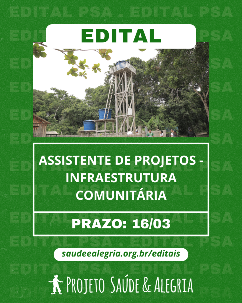 Sistema de Seleção do(a) Candidato(a): Pré-seleção por meio de análise do CV. Seleção final com entrevista. Enviar currículo até o dia 16/03/2025 para: rh@saudeealegria.org.br. No assunto da mensagem escrever “Assistente de Projetos – Infraestrutura Comunitária”.