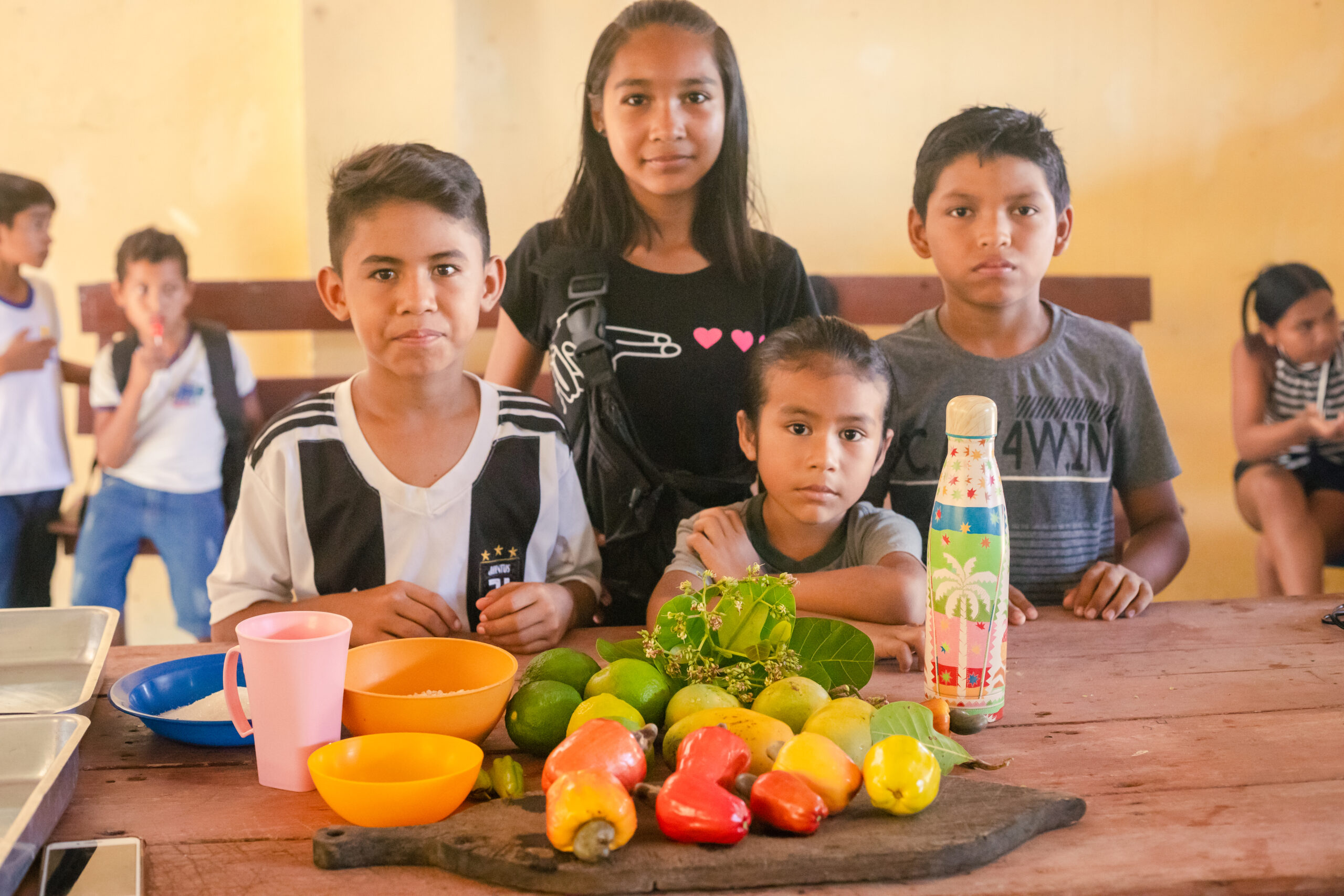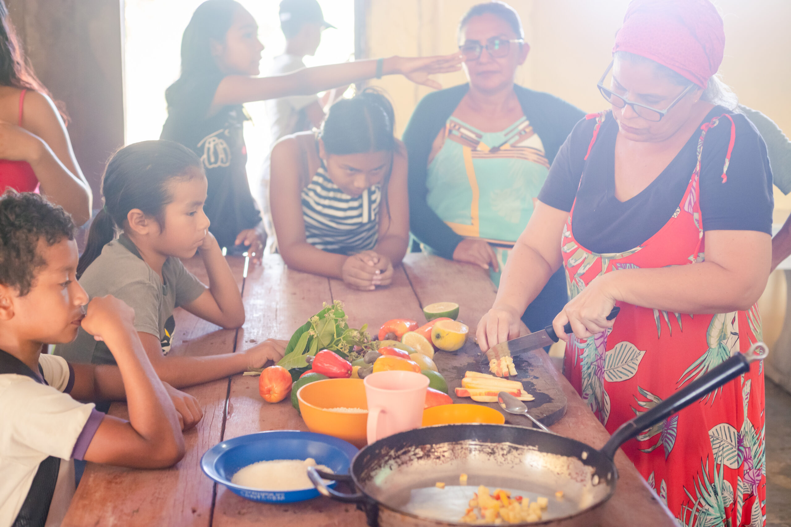 “Fiquei muito feliz de receber essa capacitação e me senti muito grata de aprender coisas que ainda não tinha visto para produzir as comidas para as crianças, e o aproveitamento que a gente não tinha. As vitaminas principais das frutas a gente não aproveitava” – Maria Suely, servente da Escola da Aldeia Takuara.