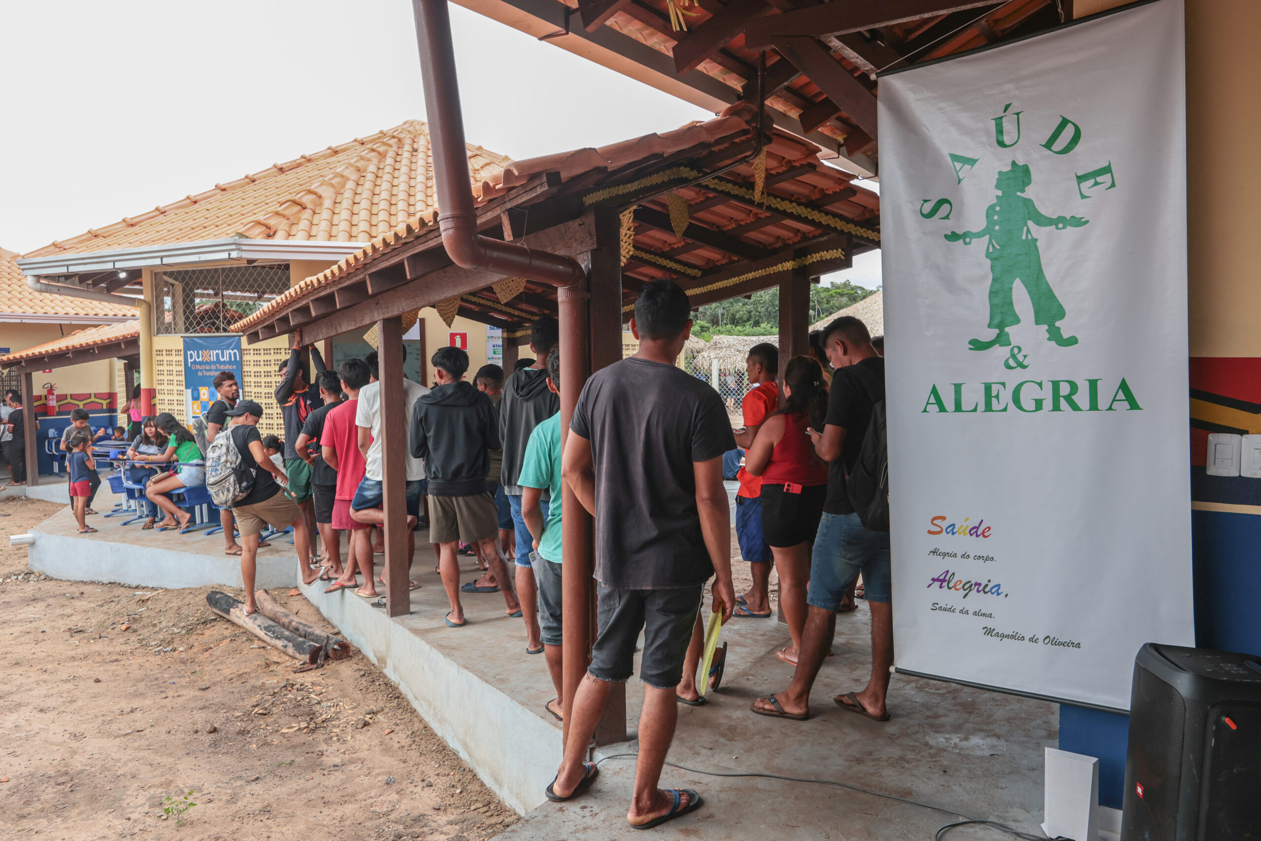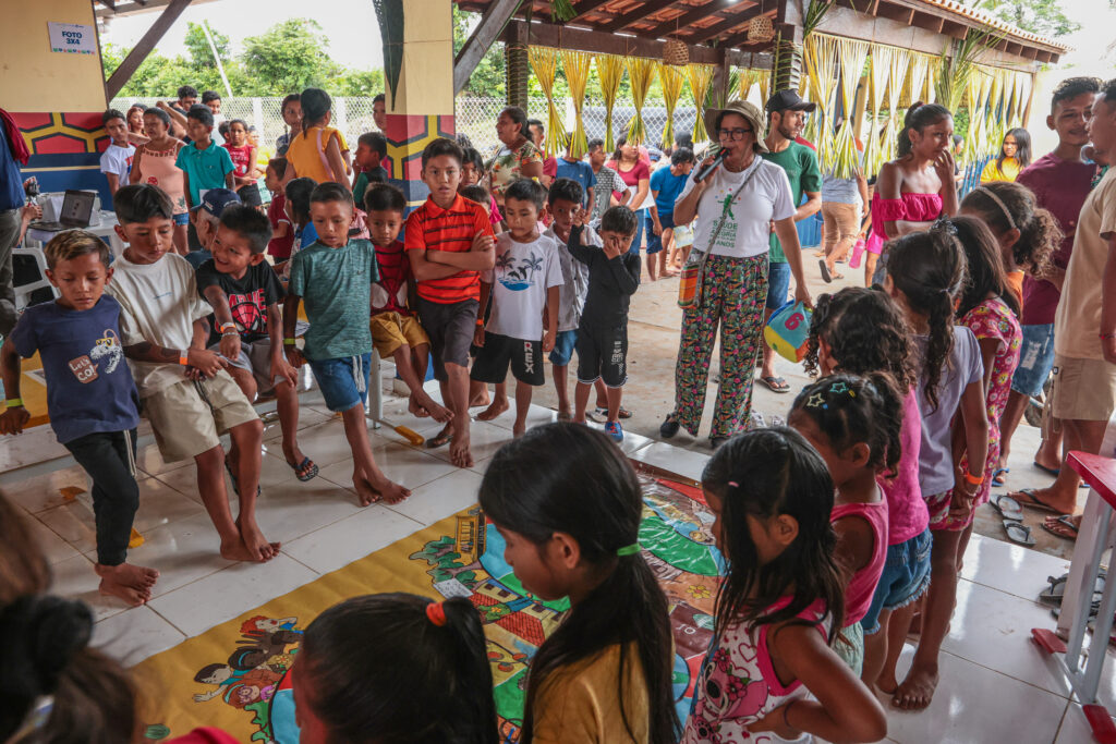 Após horas de viagem, moradores de diferentes comunidades chegaram à Aldeia Novo Lugar para acessar serviços que, em muitos casos, só seriam possíveis na sede urbana de Santarém. A Ação Cidadania reuniu atendimentos de saúde, documentação e assistência social e atividades educativas voltadas ao público infantil, conduzidas pelo Projeto Saúde e Alegria (PSA).